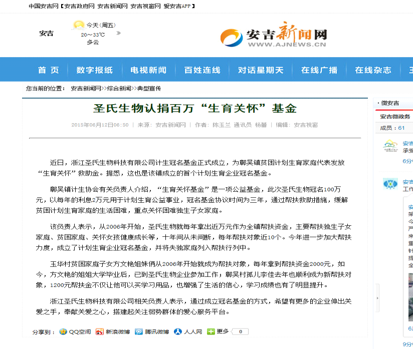 近日,浙江圣氏生物科技有限公司計生冠名基金正式成立,為鄣吳鎮(zhèn)貧困計劃生育家庭代表發(fā)放“生育關(guān)懷”救助金。據(jù)悉,這也是該鎮(zhèn)成立的首個計劃生育企業(yè)冠名基金。鄣吳鎮(zhèn)計生協(xié)會有關(guān)負責(zé)人介紹,“生育關(guān)懷基金”是一項公益基金,此次圣氏生物冠名100萬元,以每年的利息2萬元用于計劃生育公益事業(yè),冠名基金協(xié)議時間為三年,通過幫扶救助措施,緩解貧困計劃生育家庭的生活困難,重點關(guān)懷困難獨生子女家庭。該負責(zé)人表示,從2…